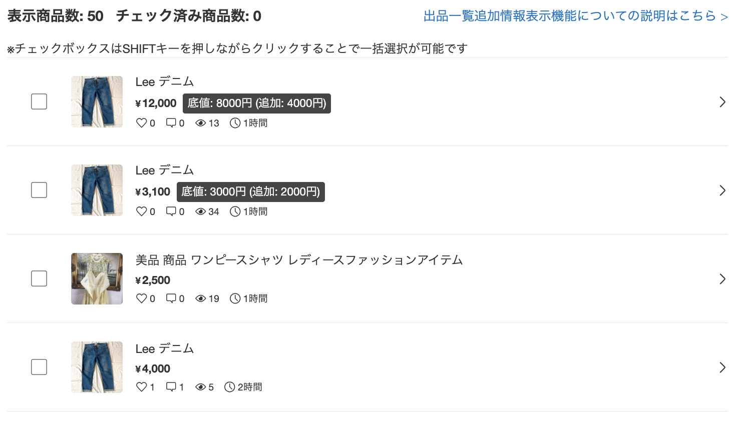 1, 出品一覧ページにて対象商品と自動化オプションを選択して作業を自動化