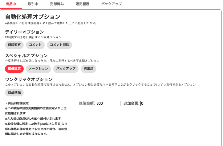 1週間分の自動化処理の予約ができ、オプションには再出品なども含まれます。
